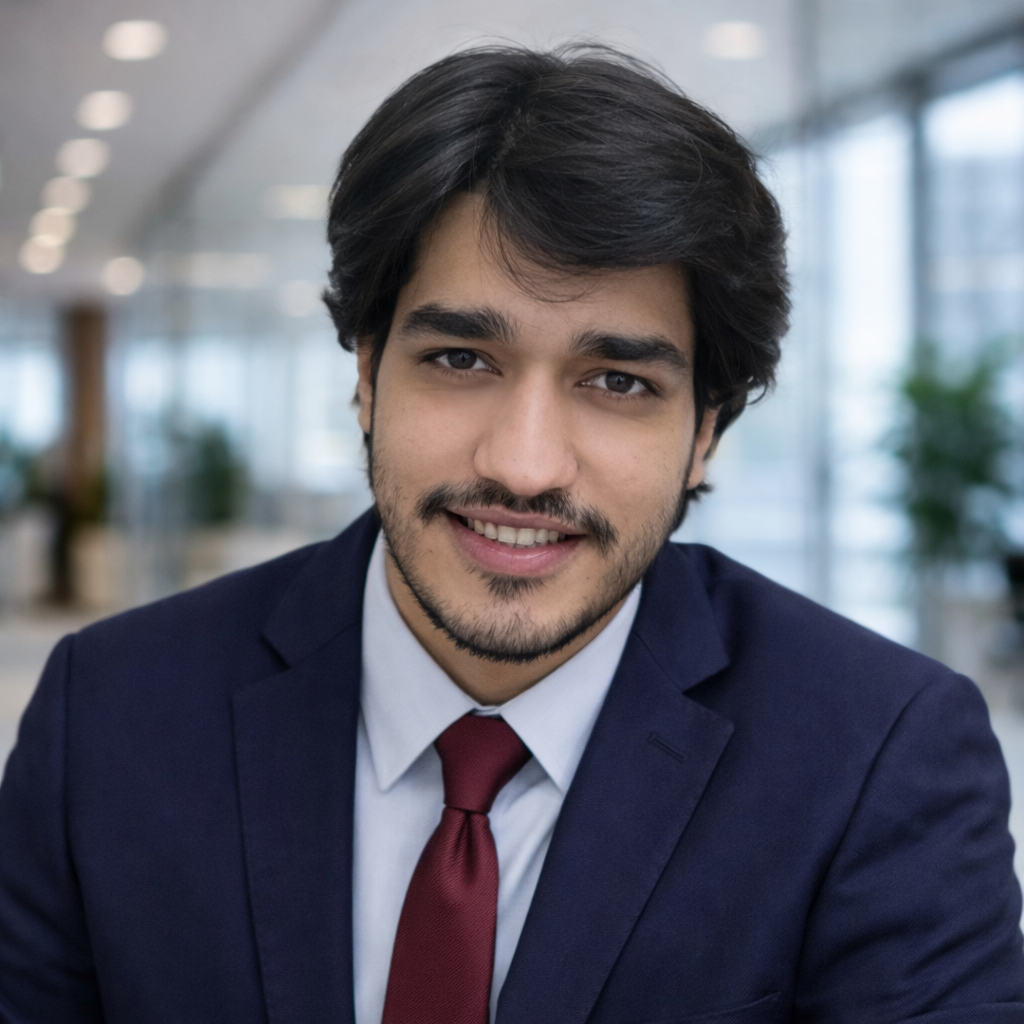 Young man with medium-length dark hair and beard wearing a navy suit, white shirt, and dark tie, posed in an office with blurred windows.